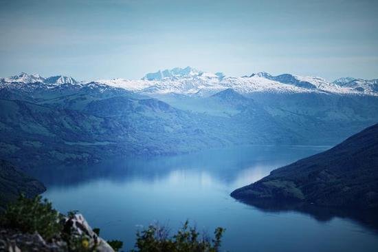 宝石蓝的湖水泛着粼粼波光,险峻的奇山屹立两旁,远处又依稀可见皑皑的雪山。如此美丽又魅惑的湖水,即使没有传说中的湖怪,四散的魅力,也足够感染每一个登山的人。